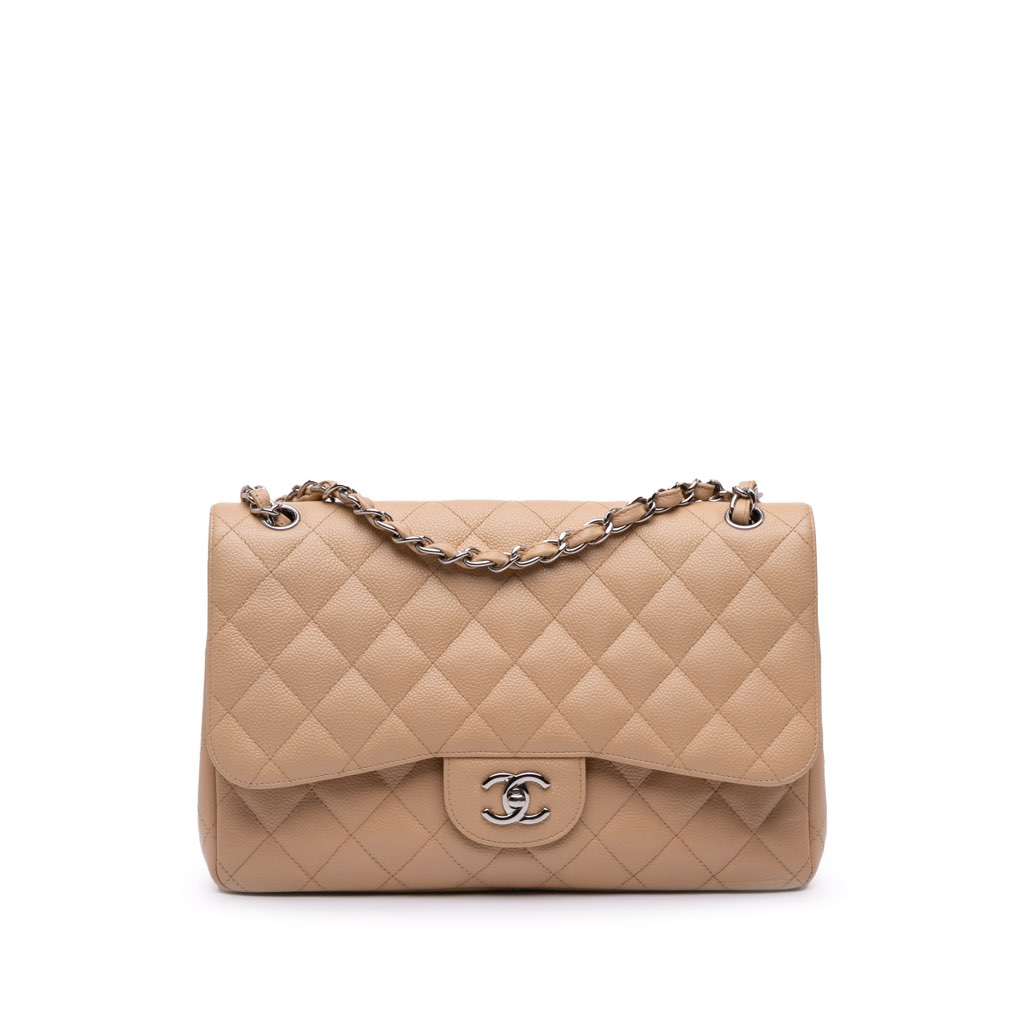 The Jumbo Classic features a quilted caviar leather body, exterior front and back slip pockets, leather woven chain straps, a double top flap with CC turn lock closure, and interior zip and slip pockets.