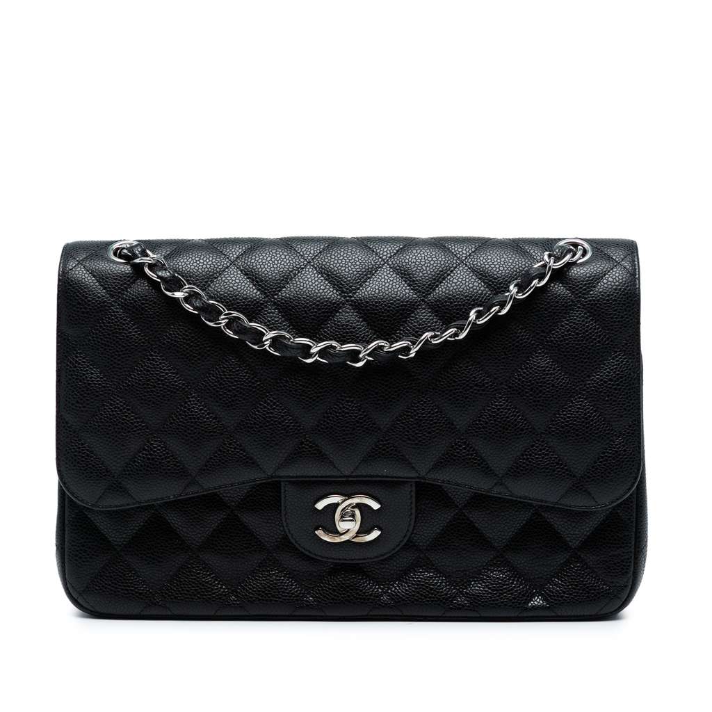 This shoulder bag features a quilted caviar leather body, leather woven chain straps, a double top flap with CC turn-lock closure, an exterior back slip pocket, and interior zip and slip pockets.