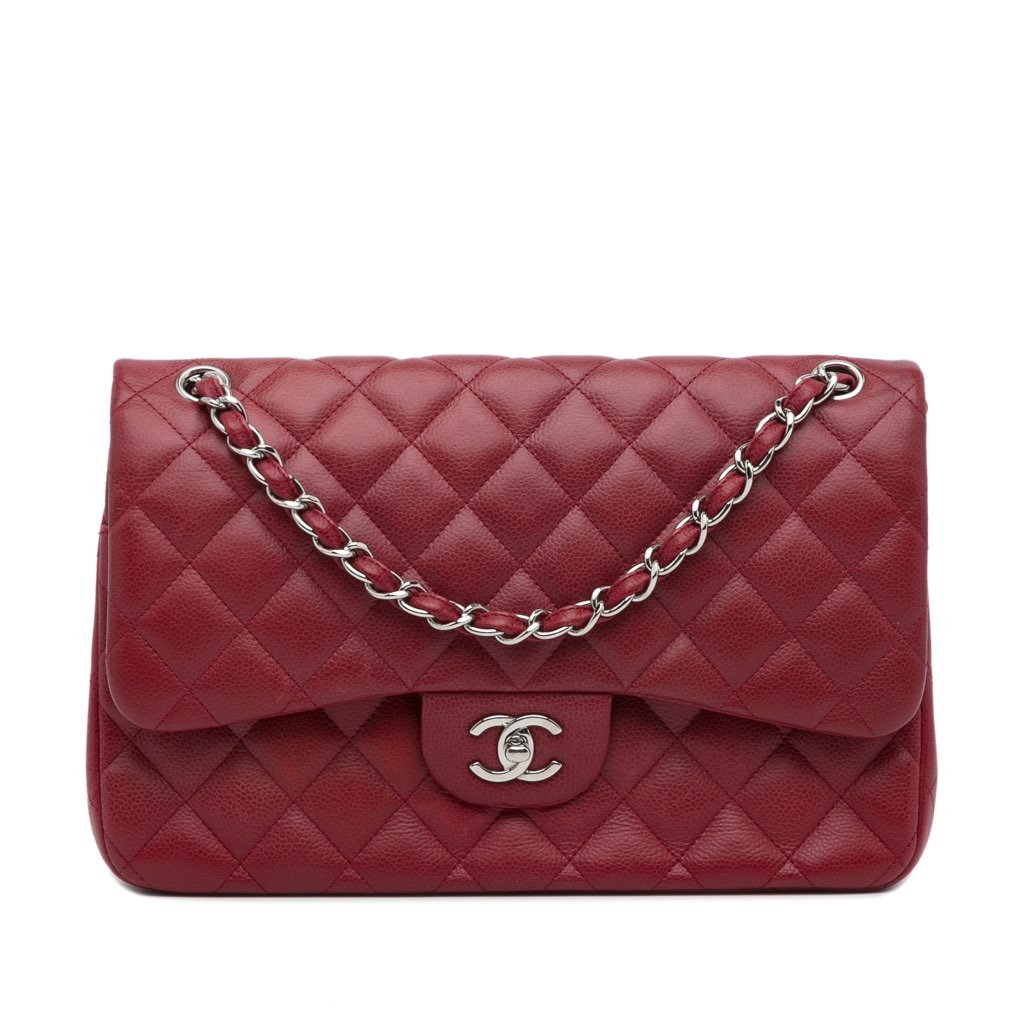 This shoulder bag features a quilted caviar leather body, leather woven chain straps, a double top flap with CC turn-lock closure, an exterior back slip pocket, and interior zip and slip pockets.