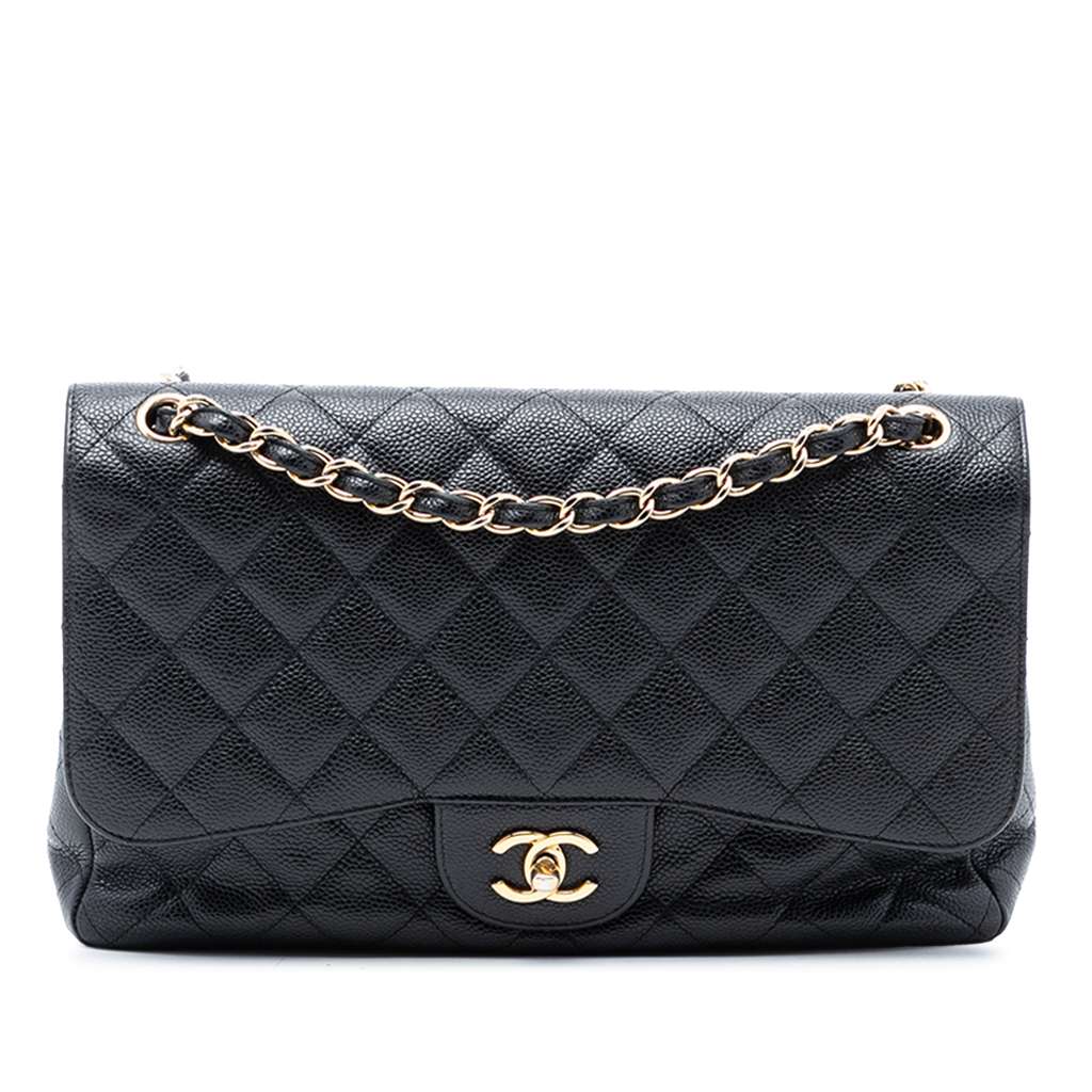 This shoulder bag features a quilted caviar leather body, leather woven chain straps, a double top flap with CC turn-lock closure, an exterior back slip pocket, and interior zip and slip pockets.