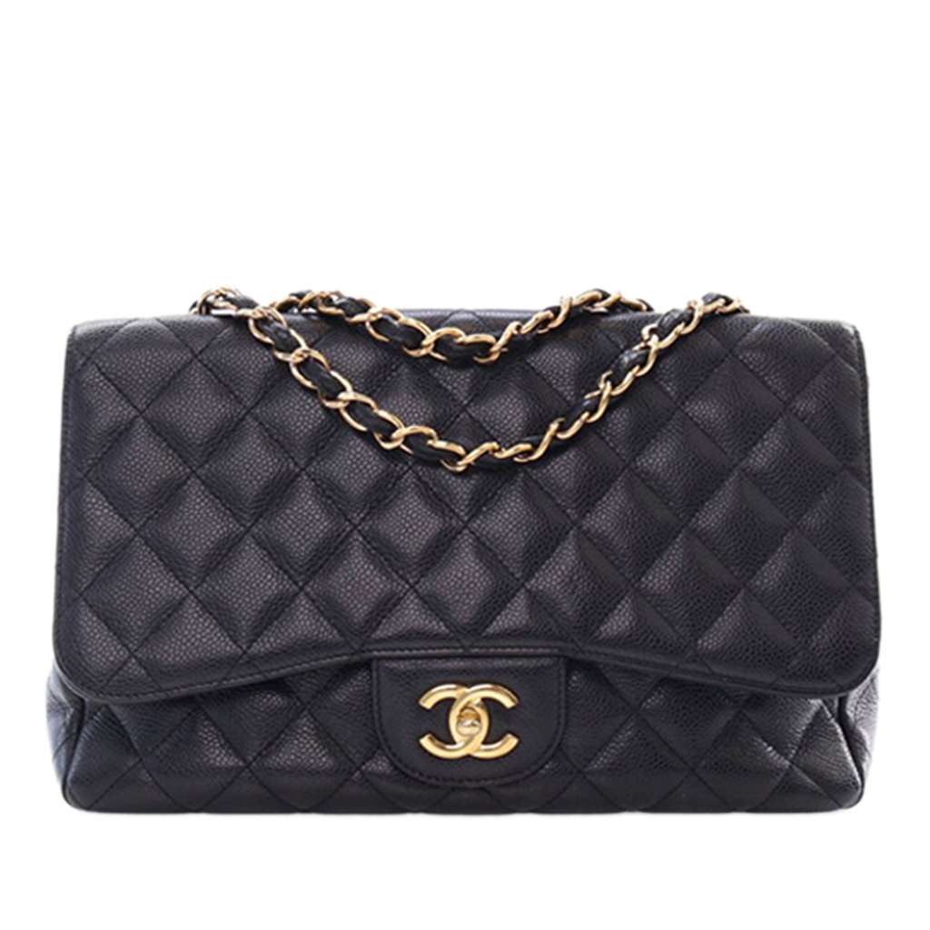 The Classic Jumbo Single Flap features a quilted caviar leather body, leather woven chain-link shoulder straps, a front flap with double Cs and twist lock closure, an exterior back slip pocket, and interior zip and slip pockets.