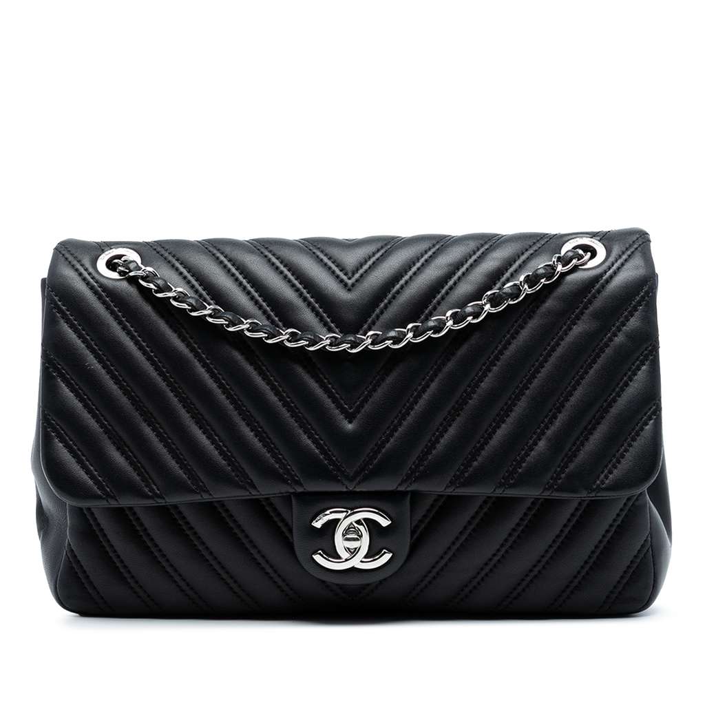 This shoulder bag features a quilted lambskin leather body, a leather-woven chain link strap with leather shoulder guard, a flap with CC turn-lock closure, and an interior zip pocket.