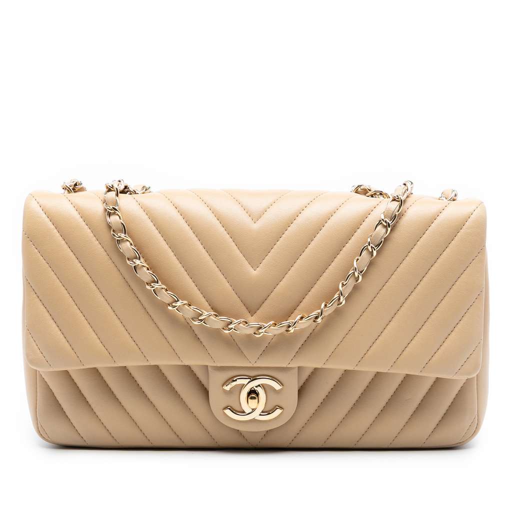 This flap features a chevron lambskin leather body, a gold-toned leather-woven chain link shoulder strap, a front flap with interlocking Cs and twist lock closure, an exterior back slip pocket, and interior zip and slip pockets. Exterior front and corners are repainted.