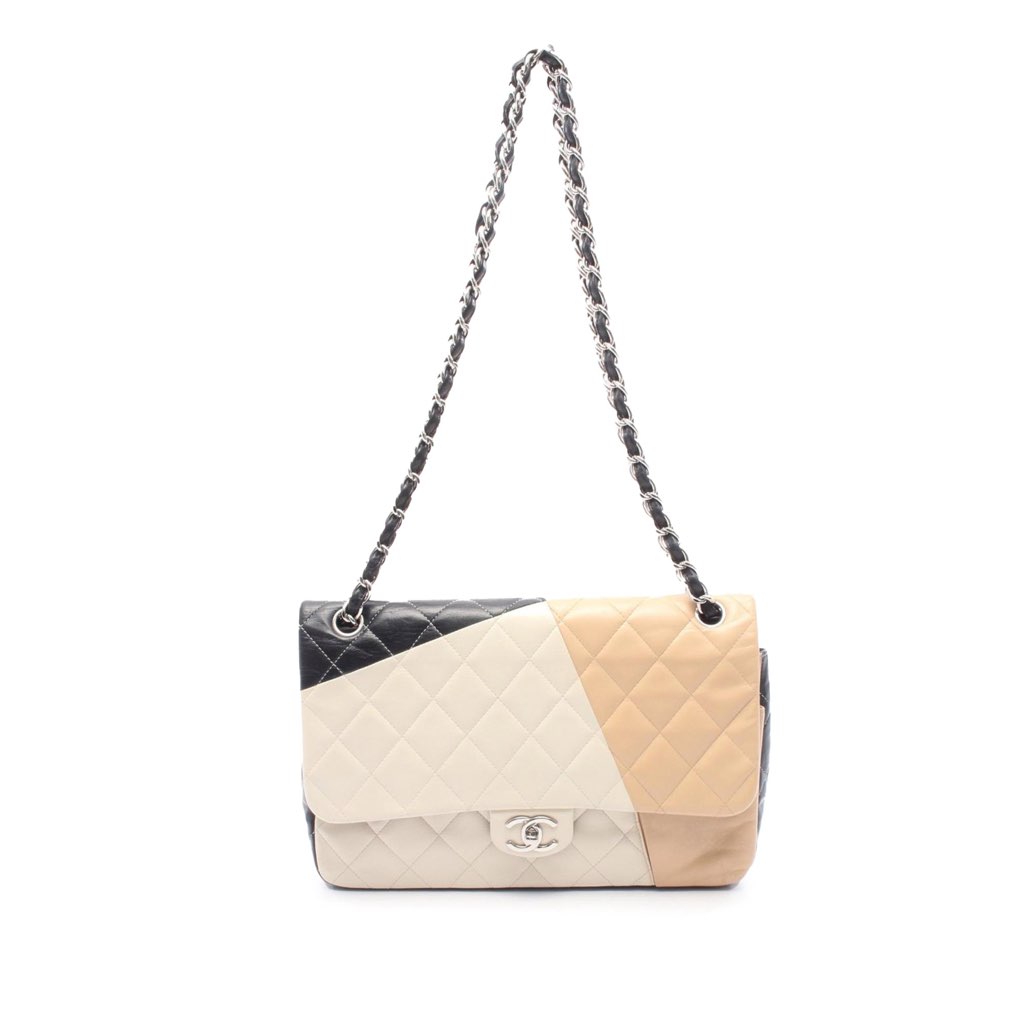 This shoulder bag features a quilted lambskin leather body, leather-woven chain straps, double front flaps with CC turn-lock closure, an exterior back slip pocket, and interior zip and slip pockets.