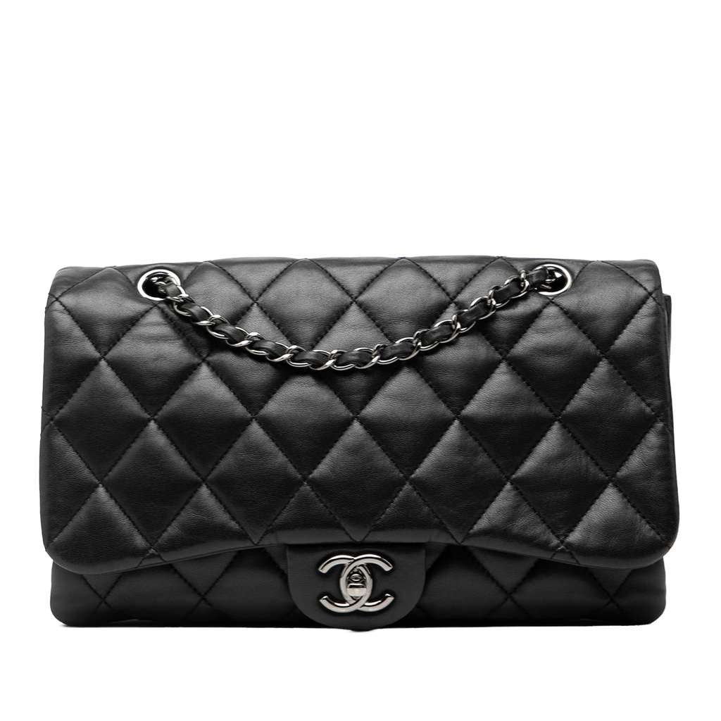 This shoulder bag features a quilted lambskin body, leather woven chain link shoulder straps, a front flap with interlocking Cs and a twist lock closure, an exterior back slip pocket, three interior compartments, and interior zip and slip pockets.