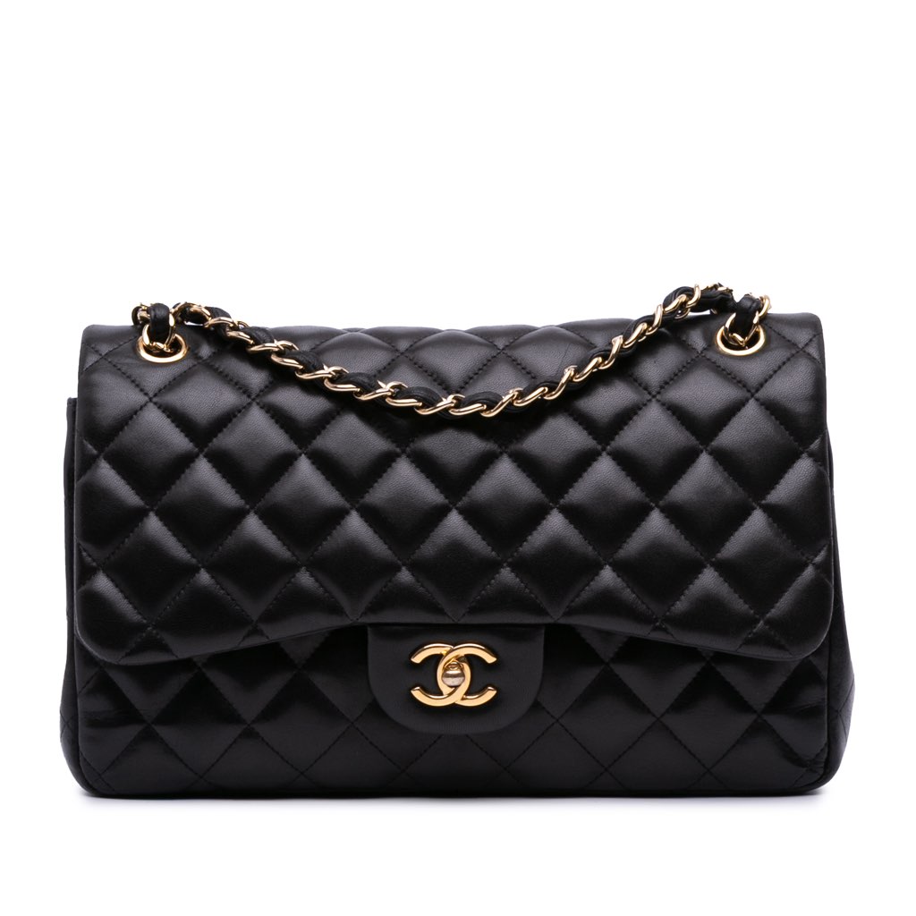 This shoulder bag features a quilted lambskin leather body, leather woven chain straps, double front flaps with CC turn-lock closure, an exterior back slip pocket, and interior zip and slip pockets.