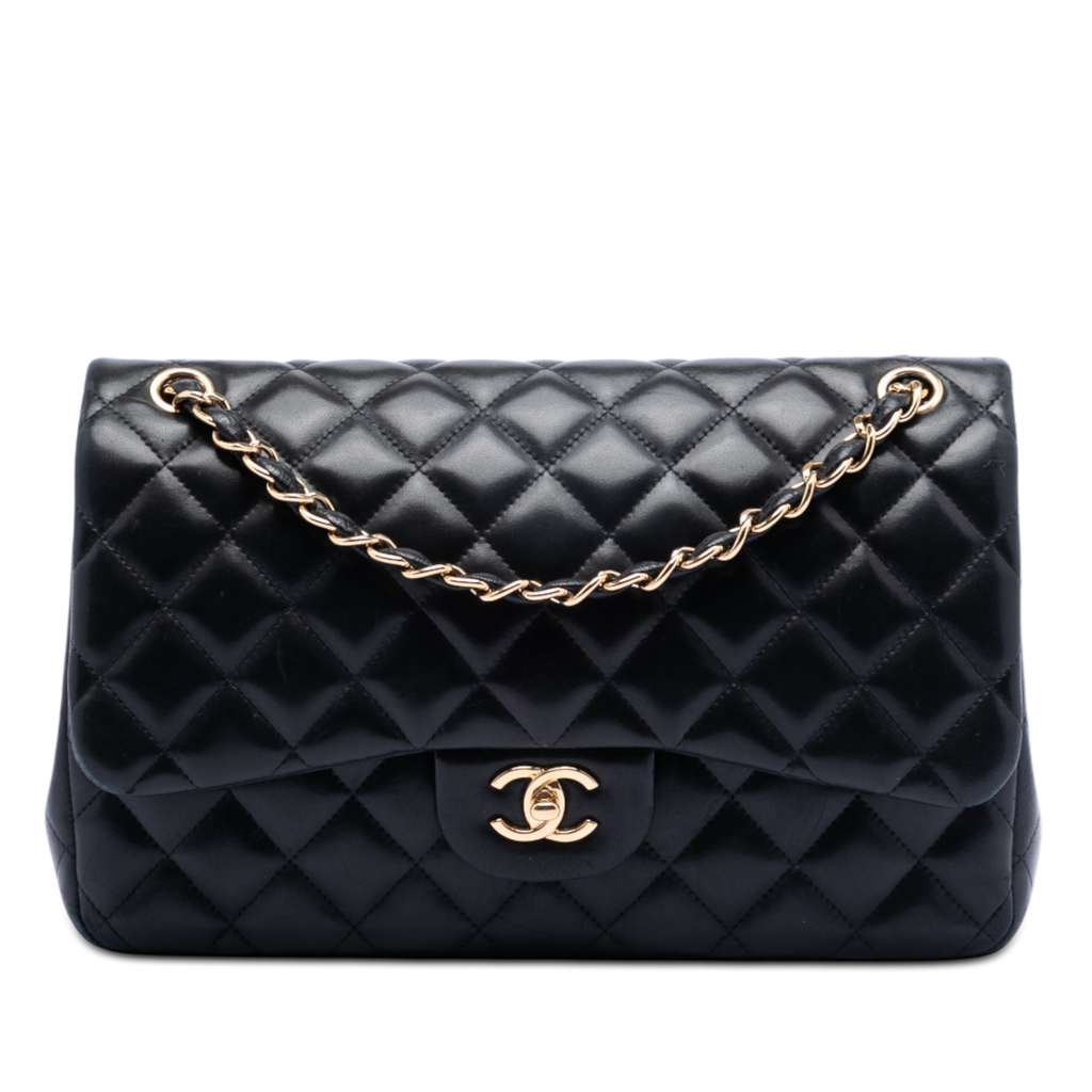 This shoulder bag features a quilted lambskin leather body, leather woven chain straps, double front flaps with CC turn-lock closure, an exterior back slip pocket, and interior zip and slip pockets.