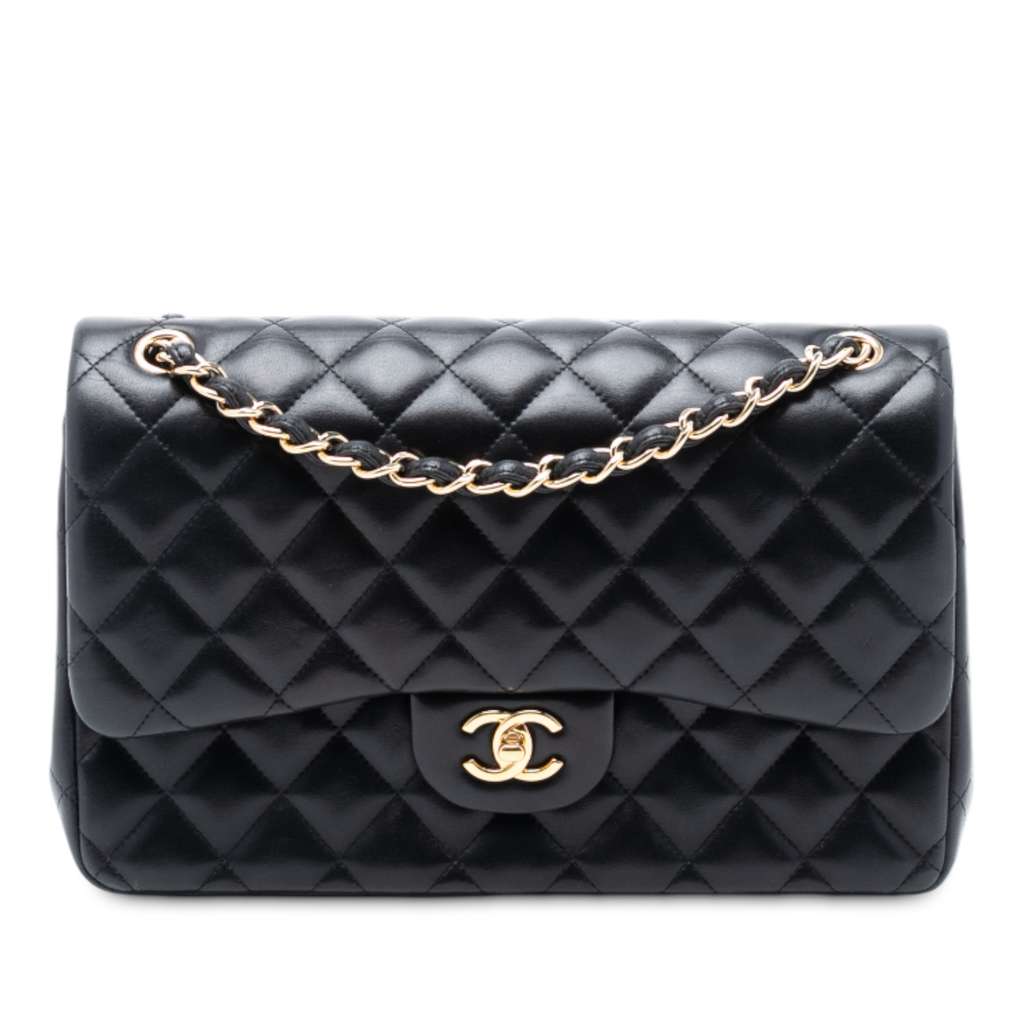 This shoulder bag features a quilted lambskin leather body, leather woven chain straps, double front flaps with CC turn-lock closure, an exterior back slip pocket, and interior zip and slip pockets.