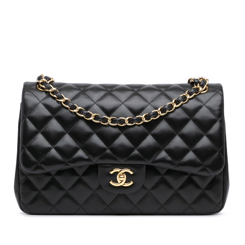 This shoulder bag features a quilted lambskin leather body, leather woven chain straps, double front flaps with CC turn-lock closure, an exterior back slip pocket, and interior zip and slip pockets.