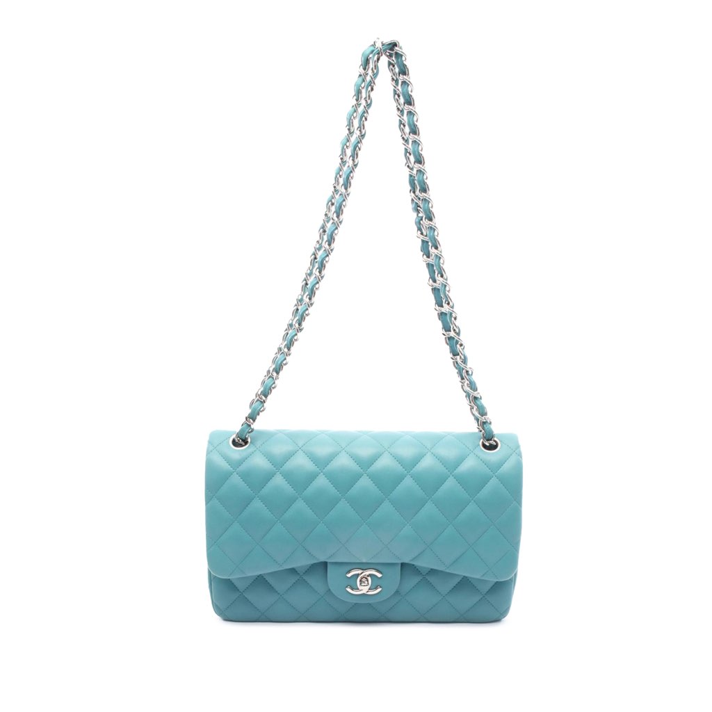 This shoulder bag features a quilted lambskin leather body, a leather woven chain strap, double top flaps with CC turn-lock closure, an exterior back slip pocket, and interior zip and slip pockets.