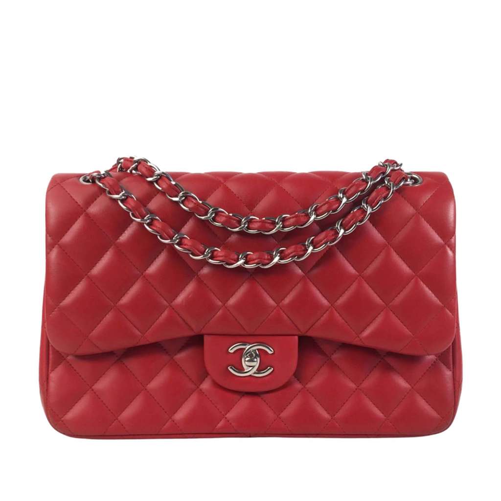 This shoulder bag features a quilted lambskin leather body, an exterior back slip pocket, velvet-woven chain straps, double front flaps with CC turnlock closure, and interior slip pockets.