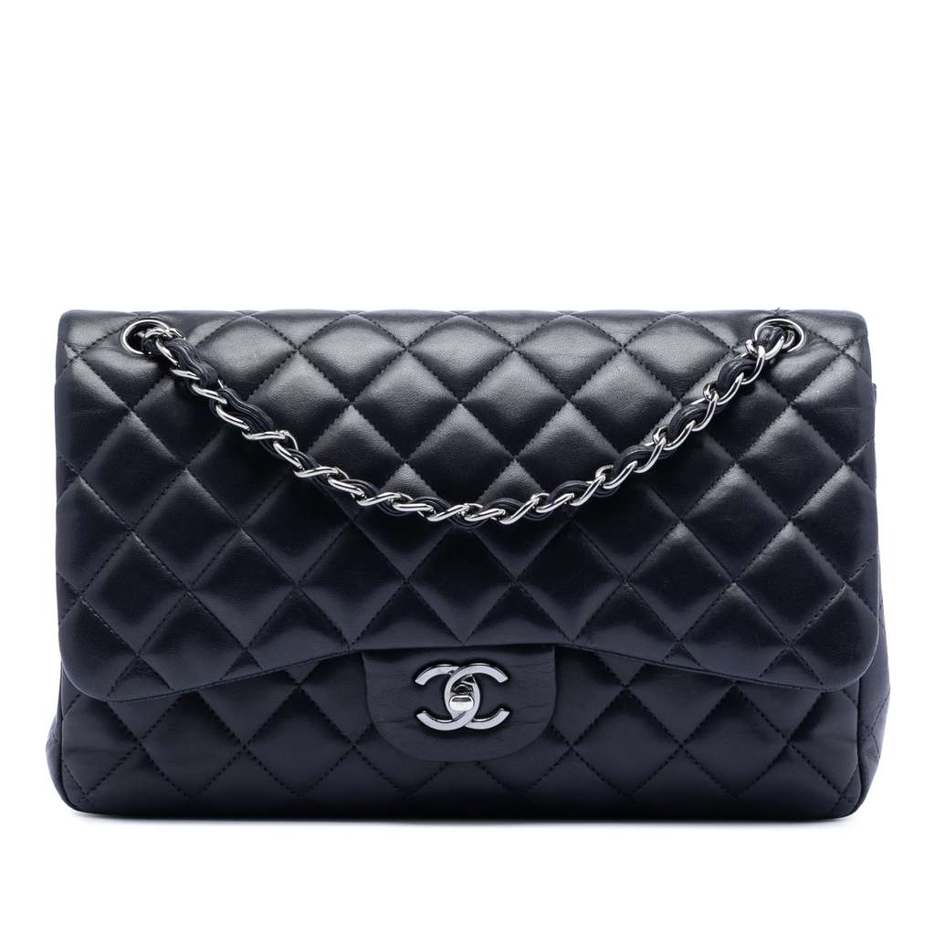 This shoulder bag features a quilted lambskin leather body, leather woven chain straps, double front flaps with CC turn-lock closure, an exterior back slip pocket, and interior zip and slip pockets.
