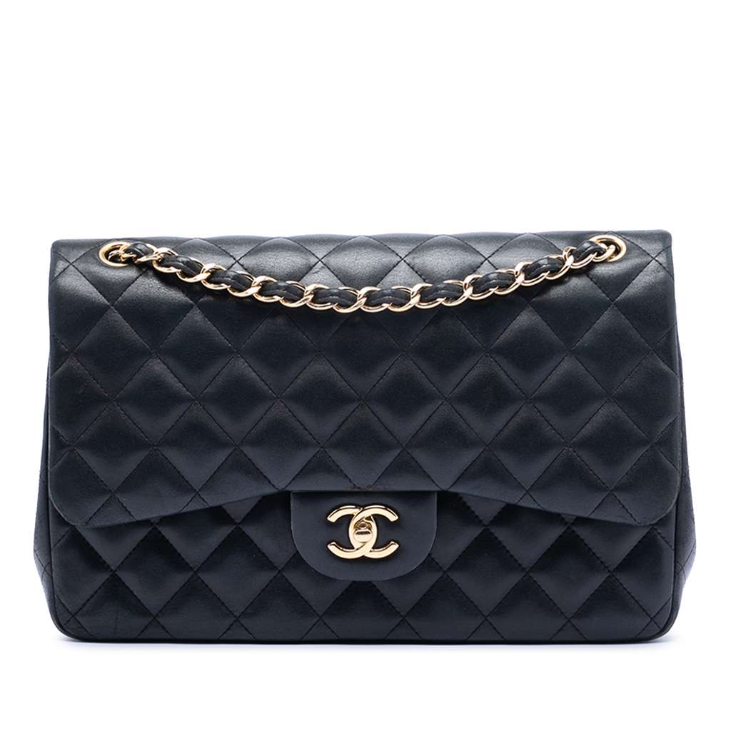 This shoulder bag features a quilted lambskin leather body, leather woven chain straps, double front flaps with CC turn-lock closure, an exterior back slip pocket, and interior zip and slip pockets.