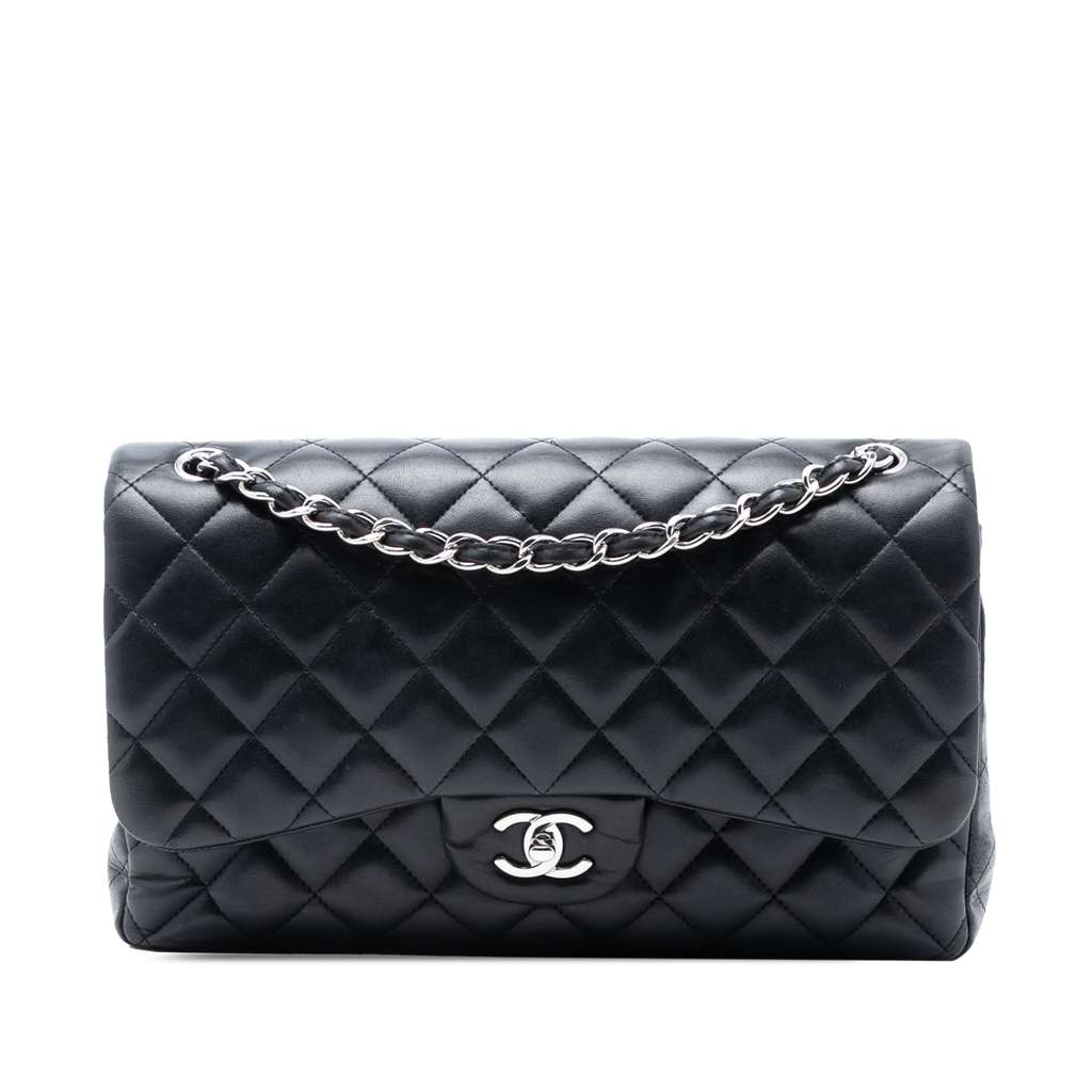 This shoulder bag features a quilted lambskin leather body, leather-woven chain straps, double front flaps with CC turnlock closure, an exterior back slip pocket, and interior zip and slip pockets.