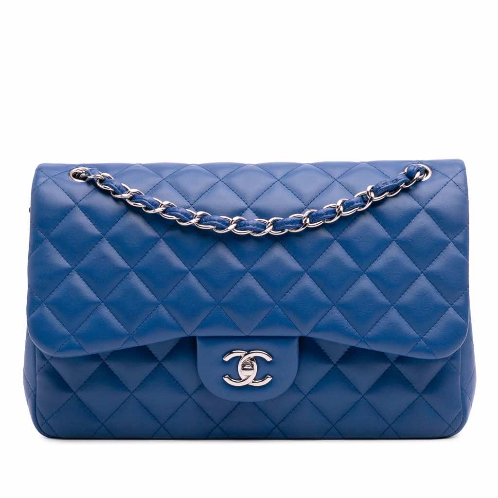 This shoulder bag features a quilted lambskin leather body, leather-woven chain straps, double front flaps with CC turnlock closure, an exterior back slip pocket, and interior zip and slip pockets.