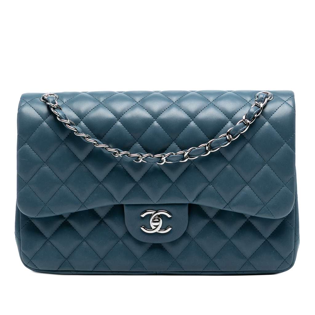 This shoulder bag features a quilted lambskin leather body, leather-woven chain straps, double front flaps with CC turn-lock closure, an exterior back slip pocket, and interior slip pockets.