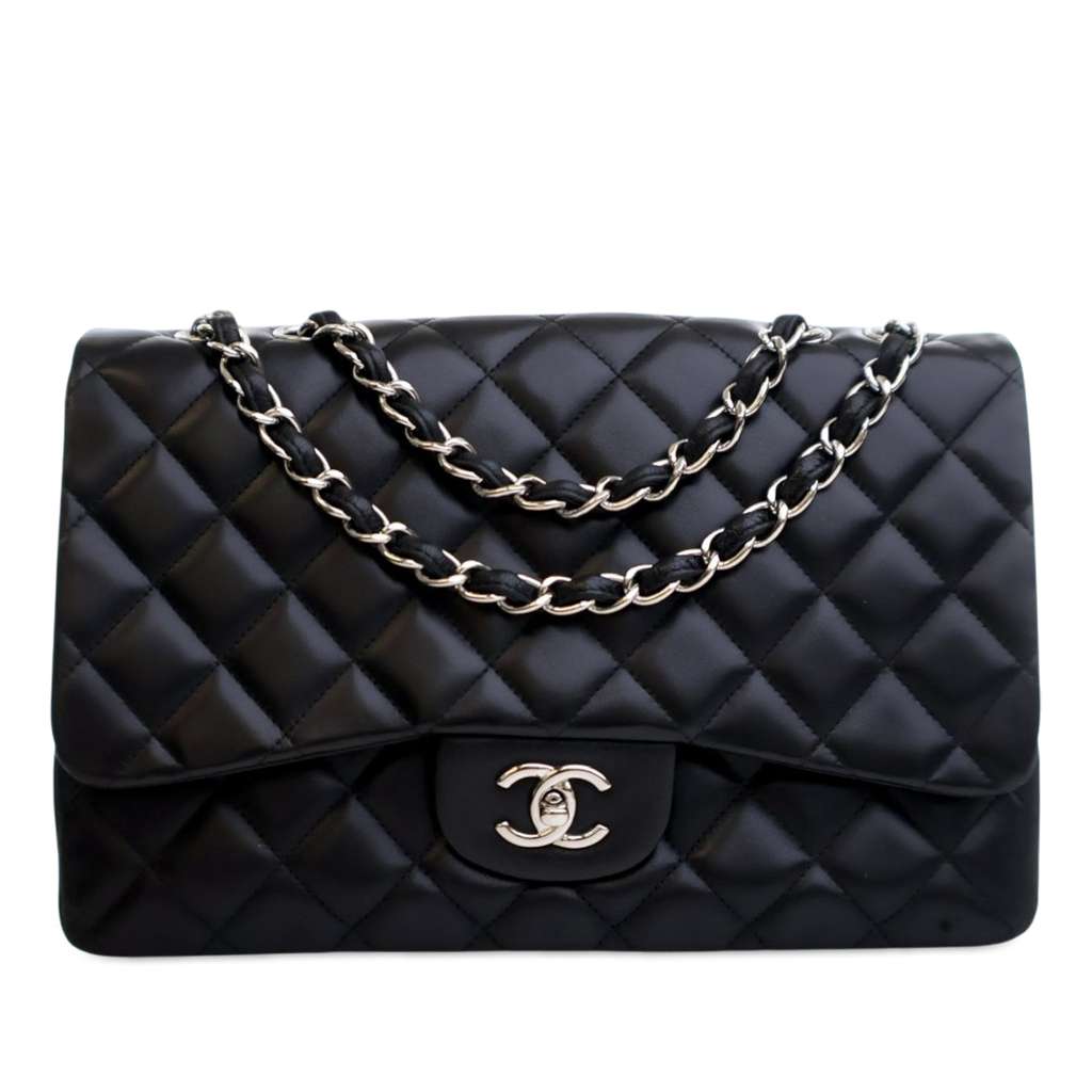 This shoulder bag features a quilted lambskin leather body, leather-woven chain straps, double front flaps with CC turnlock closure, an exterior back slip pocket, and interior zip and slip pockets.