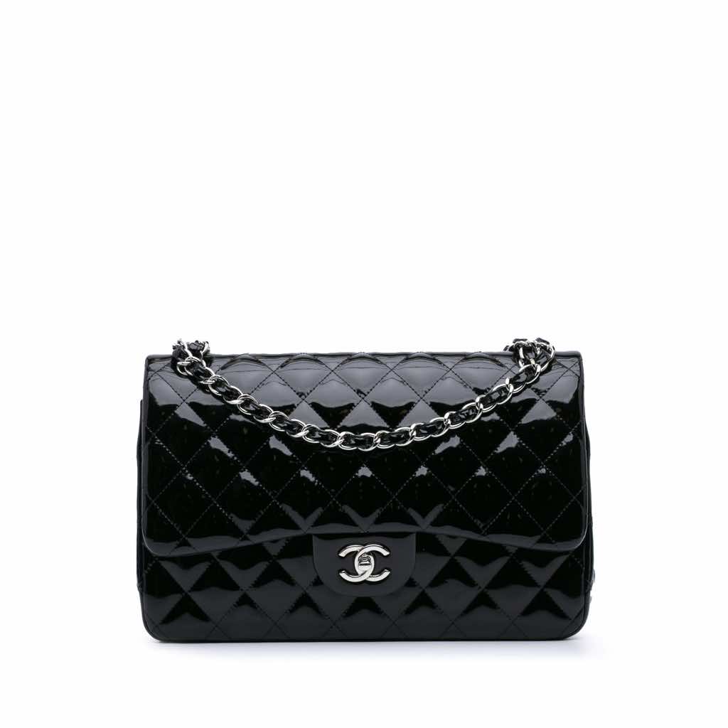 The Jumbo Classic Patent Double Flap features a quilted patent leather, leather woven chain link shoulder strap, exterior front flaps with a CC turn lock closure, an exterior back slip pocket, and interior zip and slip pockets.