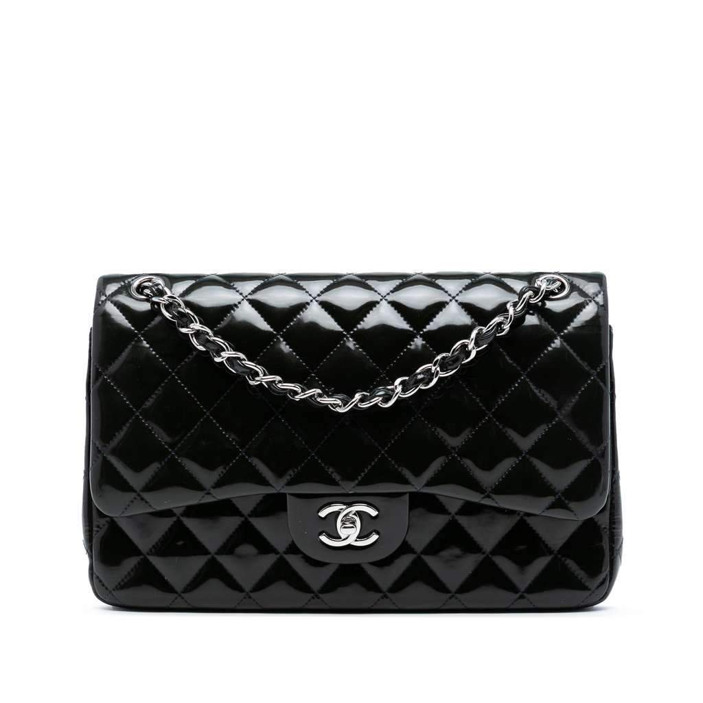 This shoulder bag features a quilted patent leather body, a leather woven chain strap, double flaps with CC turn-lock closure, an exterior back slip pocket, and interior zip and slip pockets.