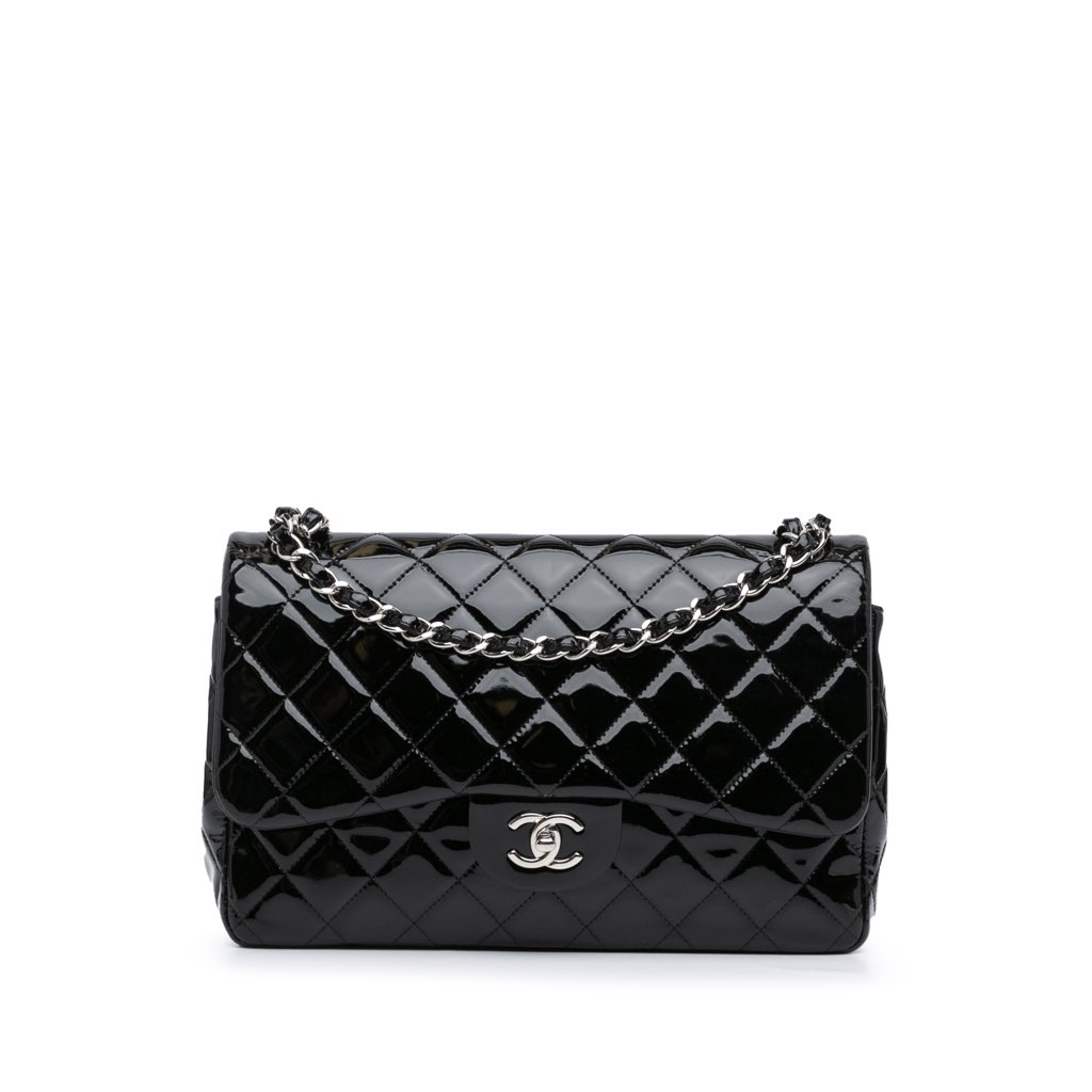 The Classic Medium features a quilted patent leather body, chain shoulder straps, double front flaps with interlocking Cs and a twist lock closure, an exterior back slip pocket, and interior zip and slip pockets.