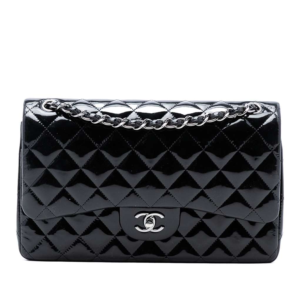 The Classic Medium features a quilted patent leather body, chain shoulder straps, double front flaps with interlocking Cs and a twist lock closure, an exterior back slip pocket, and interior zip and slip pockets.