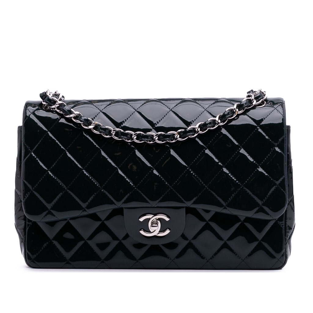 The Jumbo Classic Flap features a quilted patent leather body, leather woven chain straps, double front flaps with CC turn lock closure, an exterior back slip pocket, and interior zip and slip pockets.