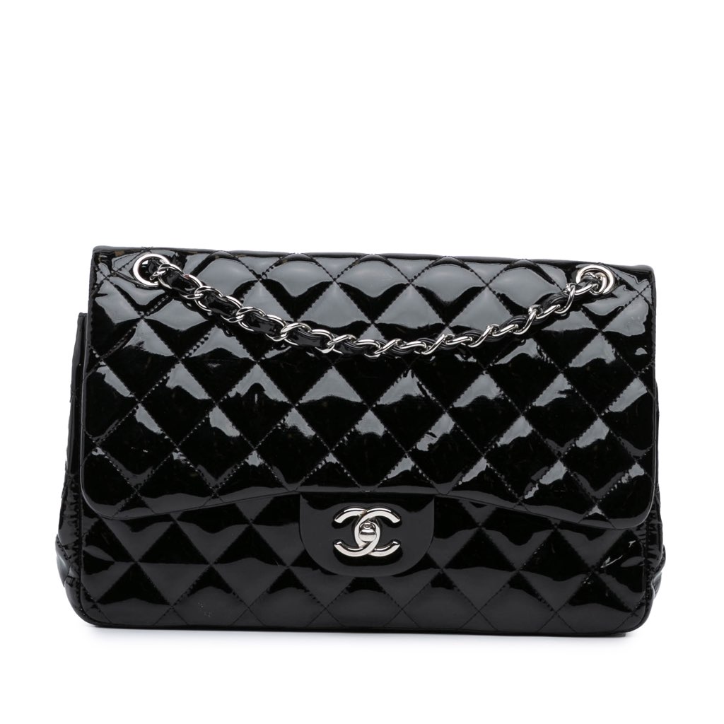 The Classic Flap features a quilted patent leather body, a leather woven chain strap, a double flap with CC turn lock closure, an exterior back slip pocket, and interior zip and slip pockets.