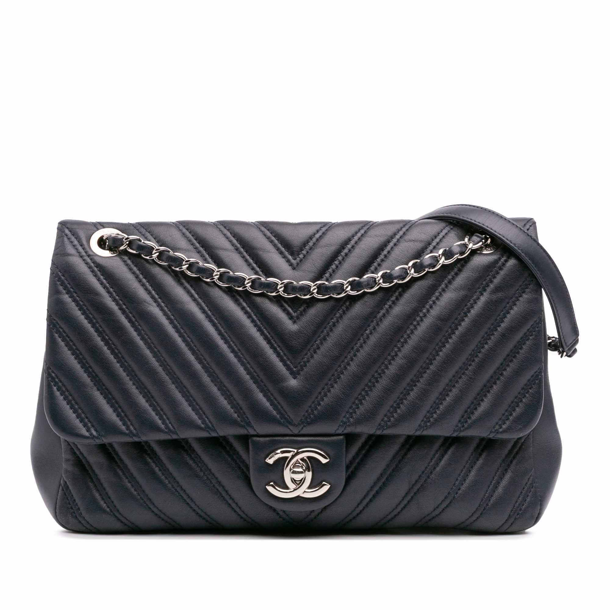 This shoulder bag features a chevron quilted lambskin leather body, leather woven chain straps with leather shoulder guard, a front flap with interlocking Cs and twist lock closure, and an interior zip pocket.