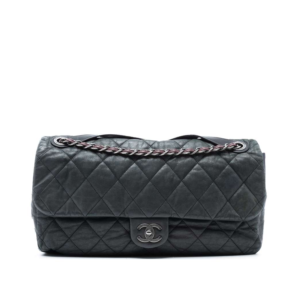 This satchel features a quilted leather body, a flat top handle, a leather-woven chain strap, a front flap with CC turn lock closure, and an interior zip pocket.