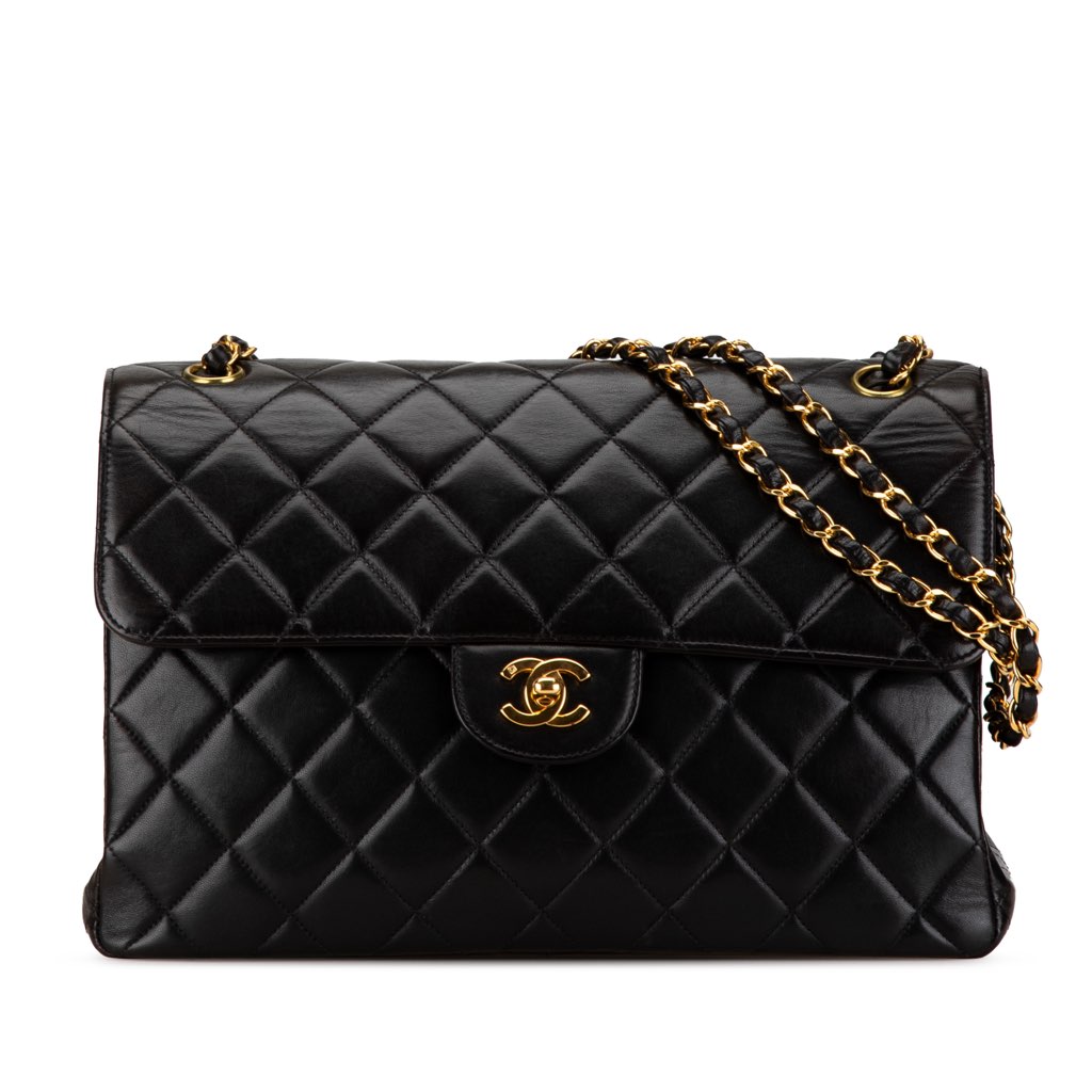 This shoulder bag features a quilted lambskin body, leather woven chain straps, double sided flaps with interlocking Cs and a twist lock closure, and interior zip and slip pockets.