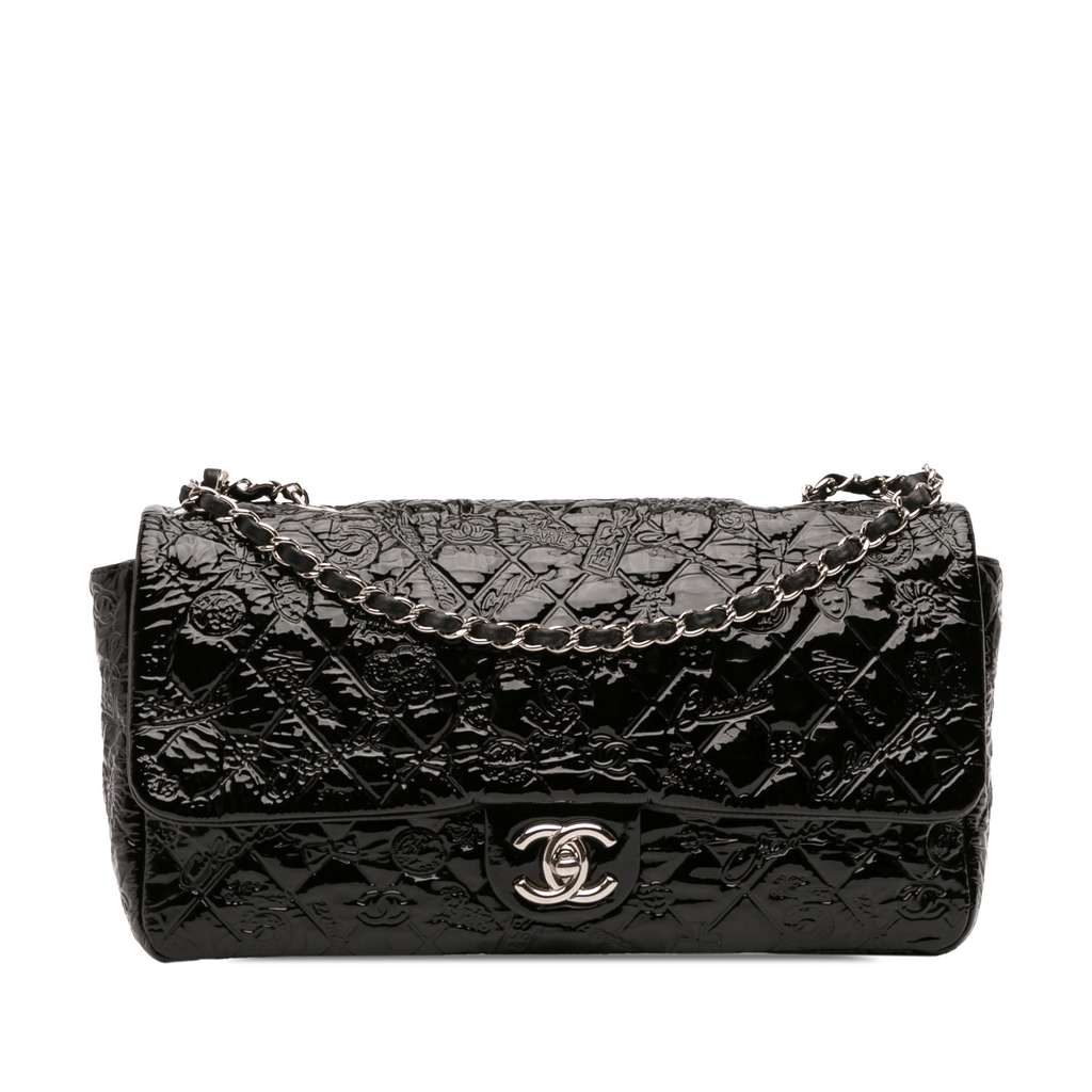 This shoulder bag features a quilted patent leather body, leather woven chain shoulder straps, a flap with CC turn-lock closure, and interior zip and slip pockets.