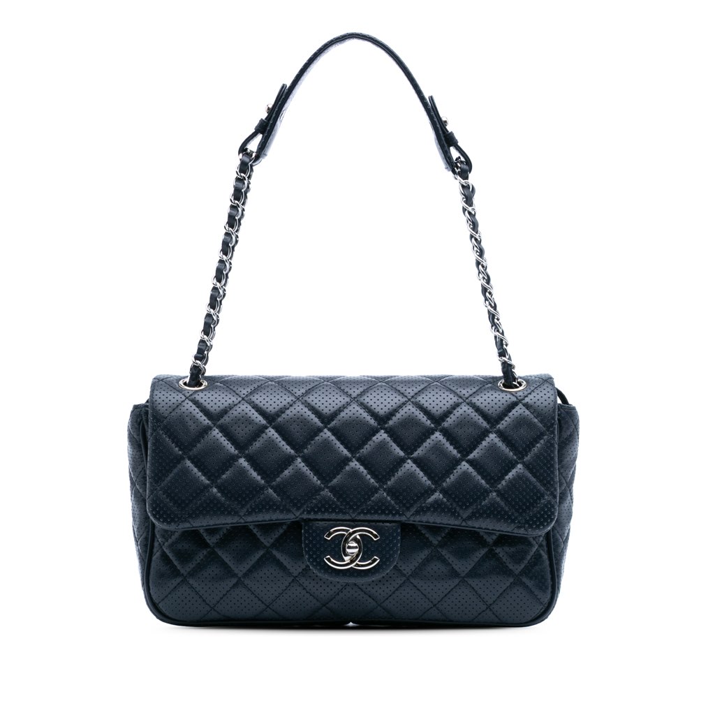 This shoulder bag features a quilted perforated lambskin leather body, a leather woven chain link strap with leather shoulder guard, a front flap with a CC turn-lock closure, an exterior back slip pocket, and interior zip and slip pockets.
