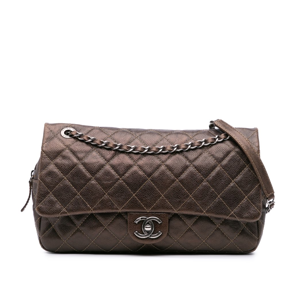 The Easy Flap features a quilted caviar leather body, a leather woven chain link strap with leather guard, a front flap with double Cs and twist lock closure, a top zip closure, and interior zip pocket.