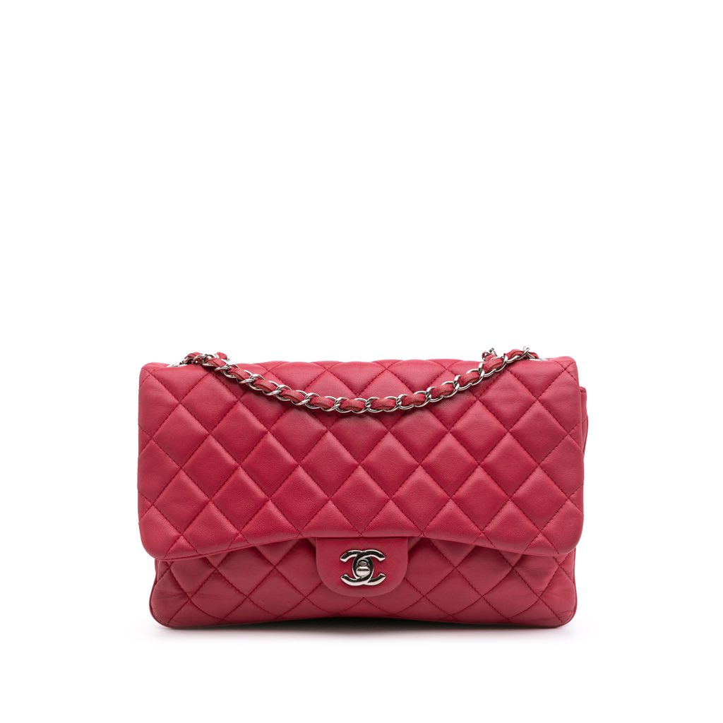 This flap bag features a quilted lambskin leather body, leather woven chain link shoulder straps, a front flap with turn lock closure, an exterior back slip pocket, three interior compartments, and interior zip and slip pockets.
