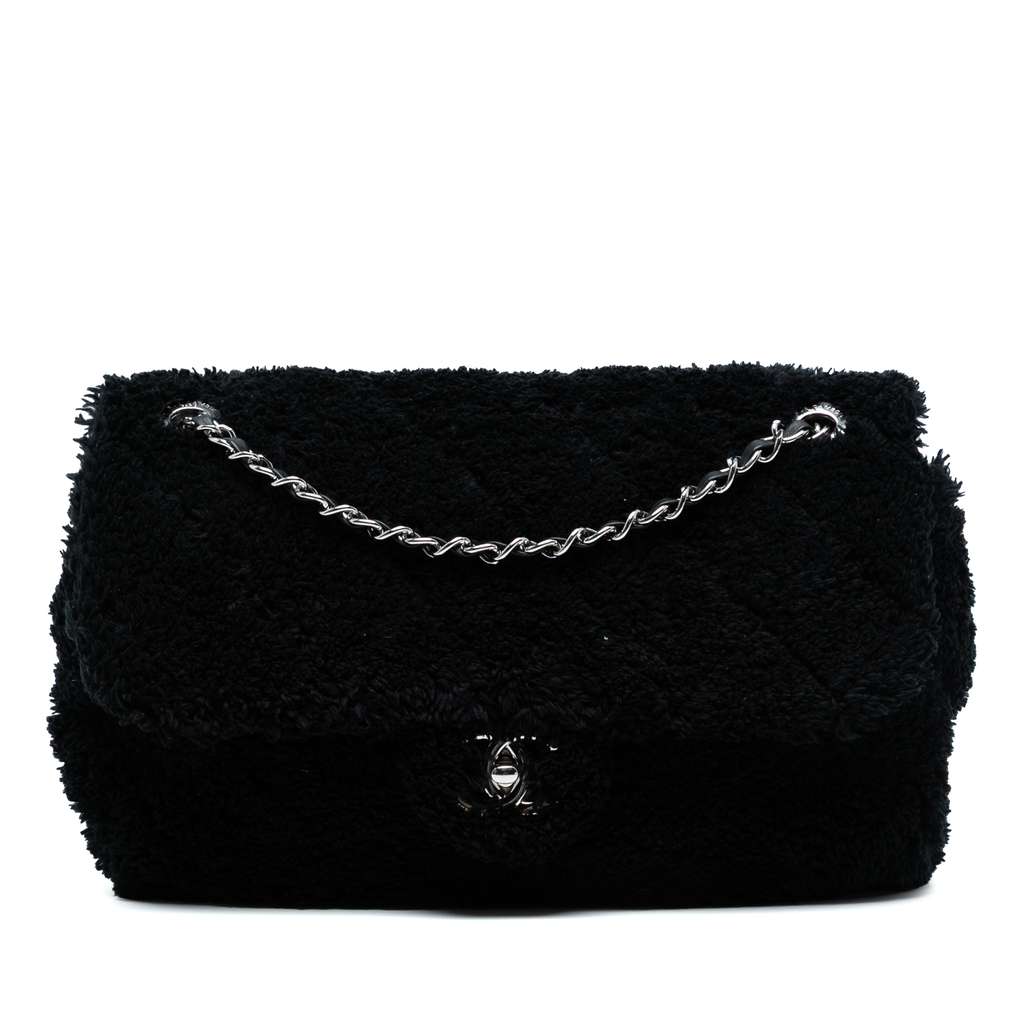 This flap bag features a shearling body with leather trim, leather woven chain straps, a front flap with CC turnlock closure, and an interior zip pocket.