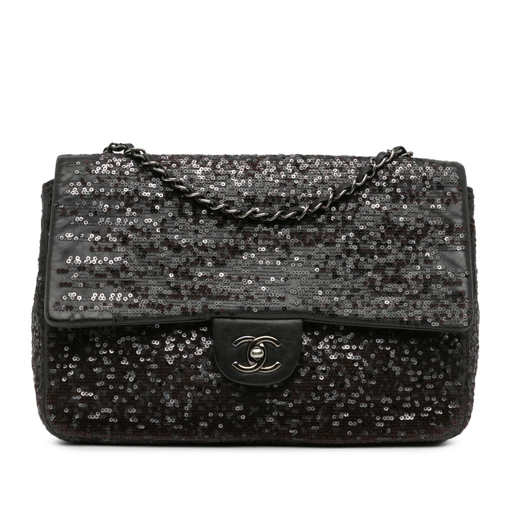 This shoulder bag features a sequin embellished lambskin leather body, leather woven chain link straps, a front flap with a CC turn-lock closure, an exterior back slip pocket, and an interior zip pocket. The lining is repainted.