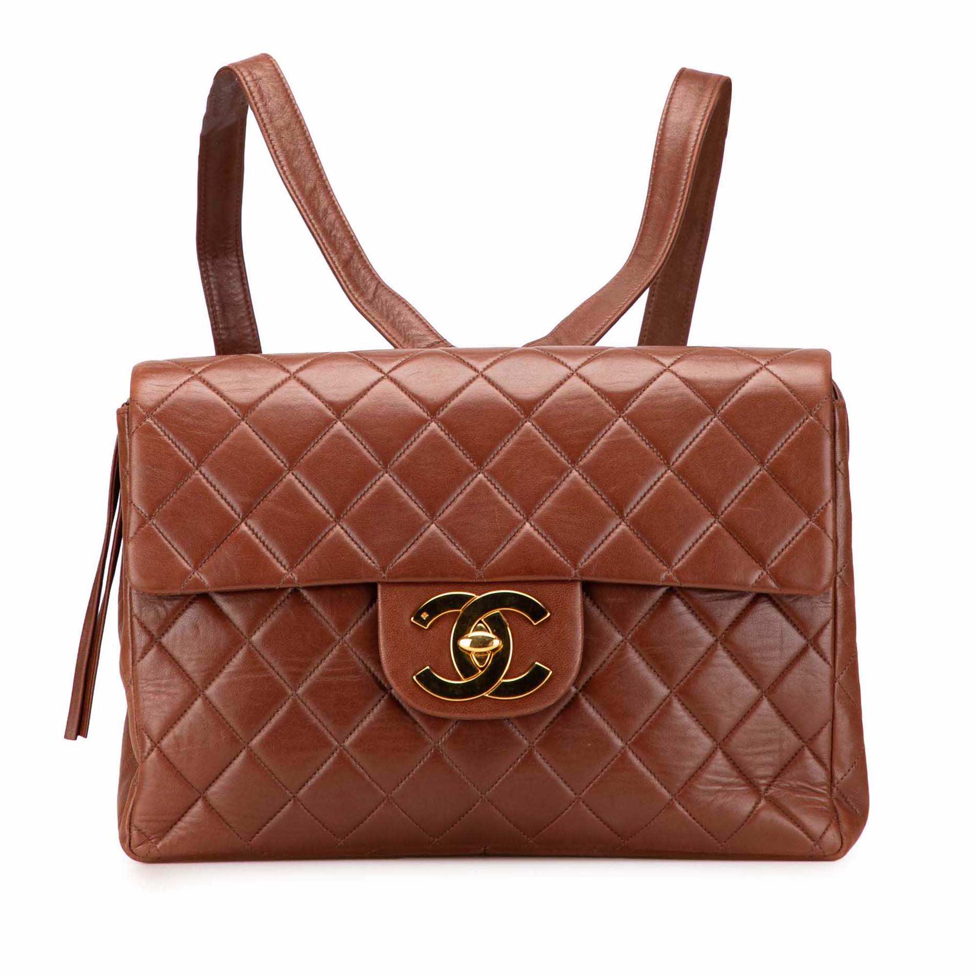 This backpack features a quilted lambskin leather body, a flat top handle, flat leather and chain back straps, a front flap with CC turn lock closure, an exterior back slip pocket, and interior zip and slip pockets.