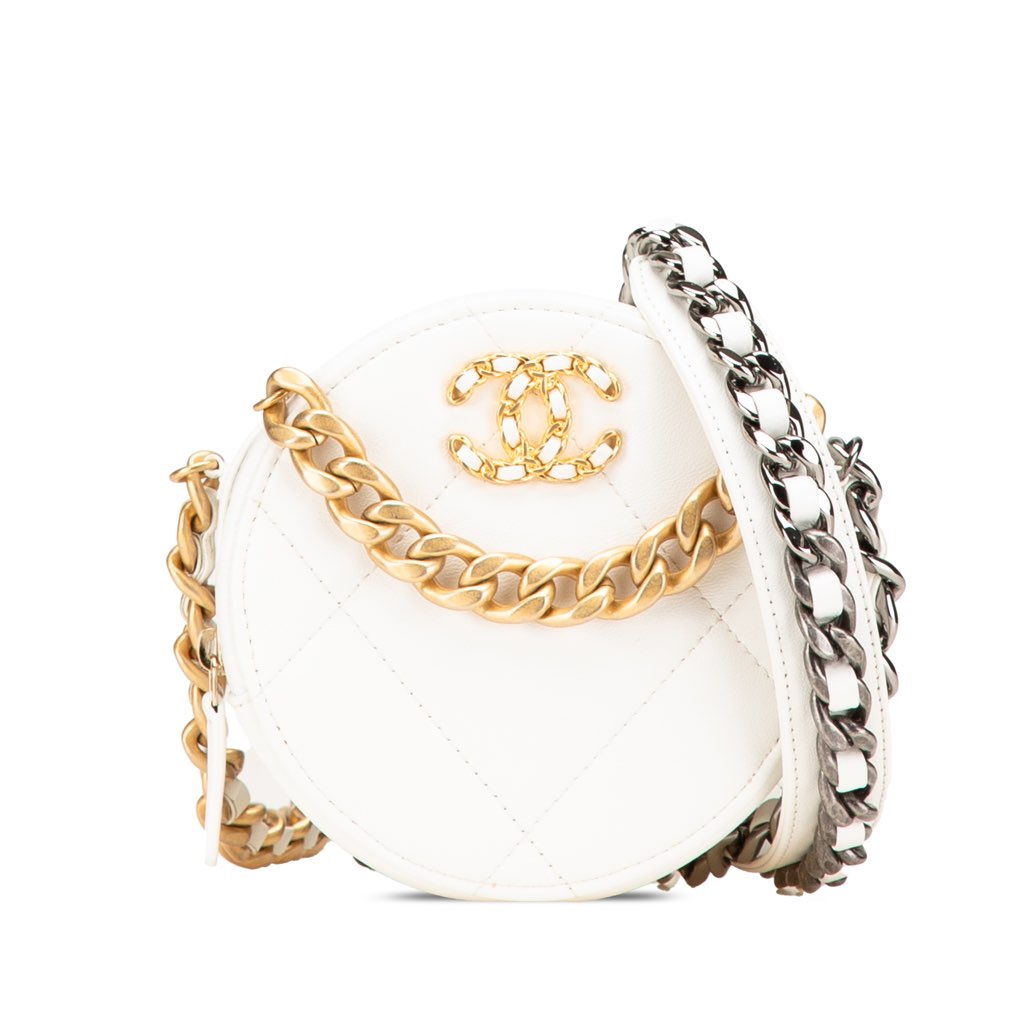 This satchel features a quilted lambskin leather body, a gold-tone chain-link handle, a leather-woven chain link shoulder strap, a top zip closure, and interior slip pockets.