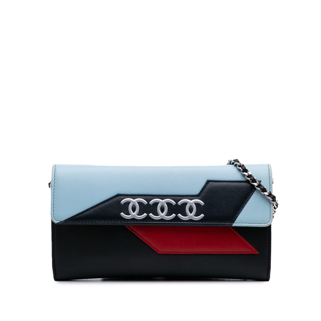 This wallet on chain features a lambskin leather body, a leather-woven chain link strap, a front flap snap button closure, interior zip and slip pockets, and removable pouches.
