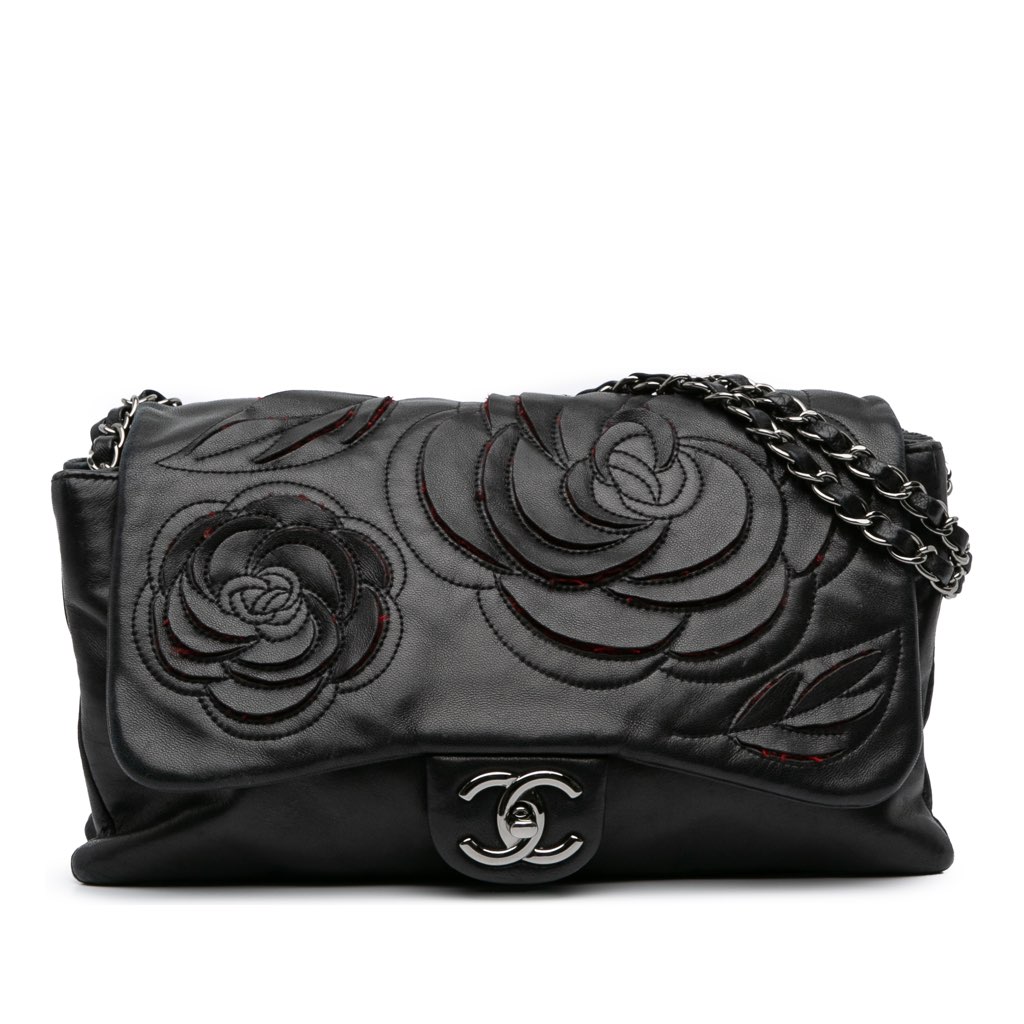 This flap features a lambskin leather body with tweed, a leather woven chain strap, a front flap with twist lock closure, three interior slip compartments, an exterior back slip pocket, and an interior zip pocket.