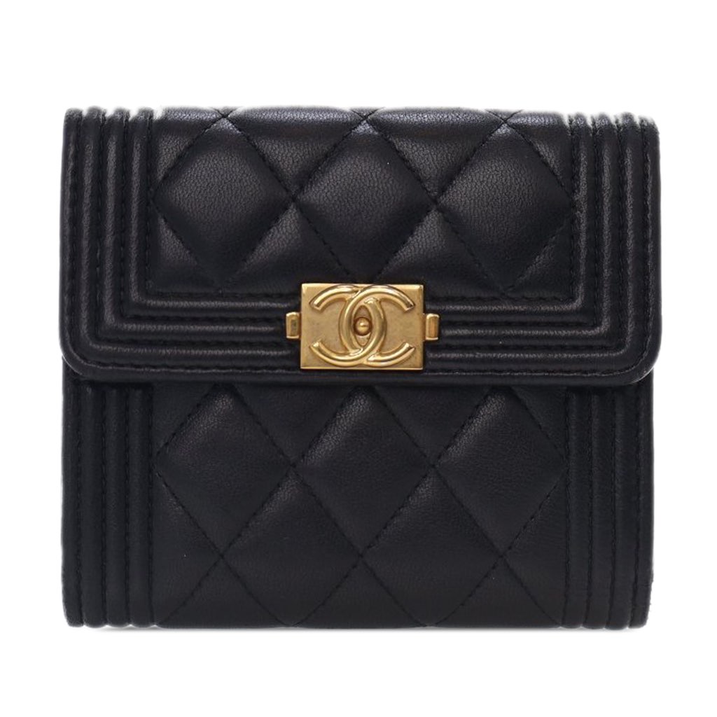 This wallet features a quilted lambskin leather body, a front flap with snap button closure, interior slip compartments and pockets, and a back exterior zip pocket.
