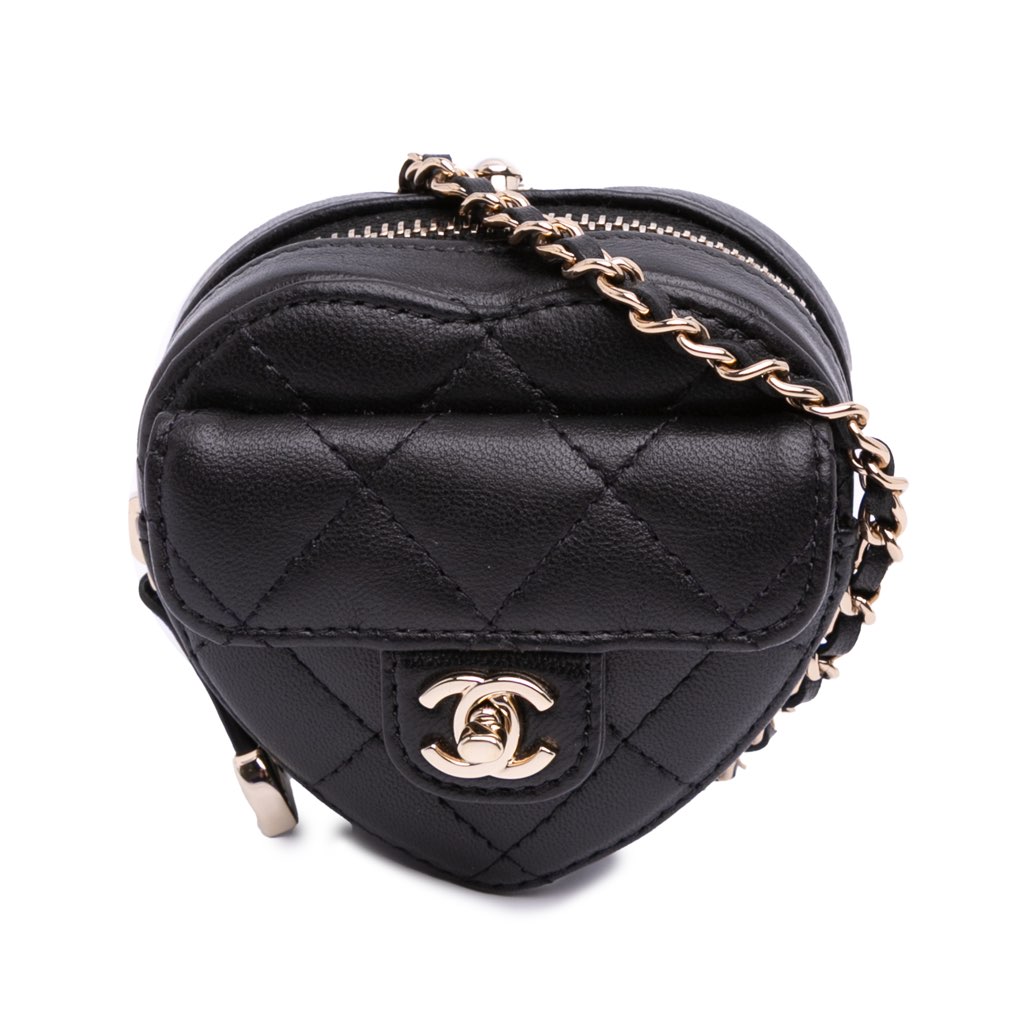 This crossbody bag features a quilted lambskin leather body, a removable leather woven chain strap, a zip-around closure, and an exterior flap pocket with CC turn-lock closure.