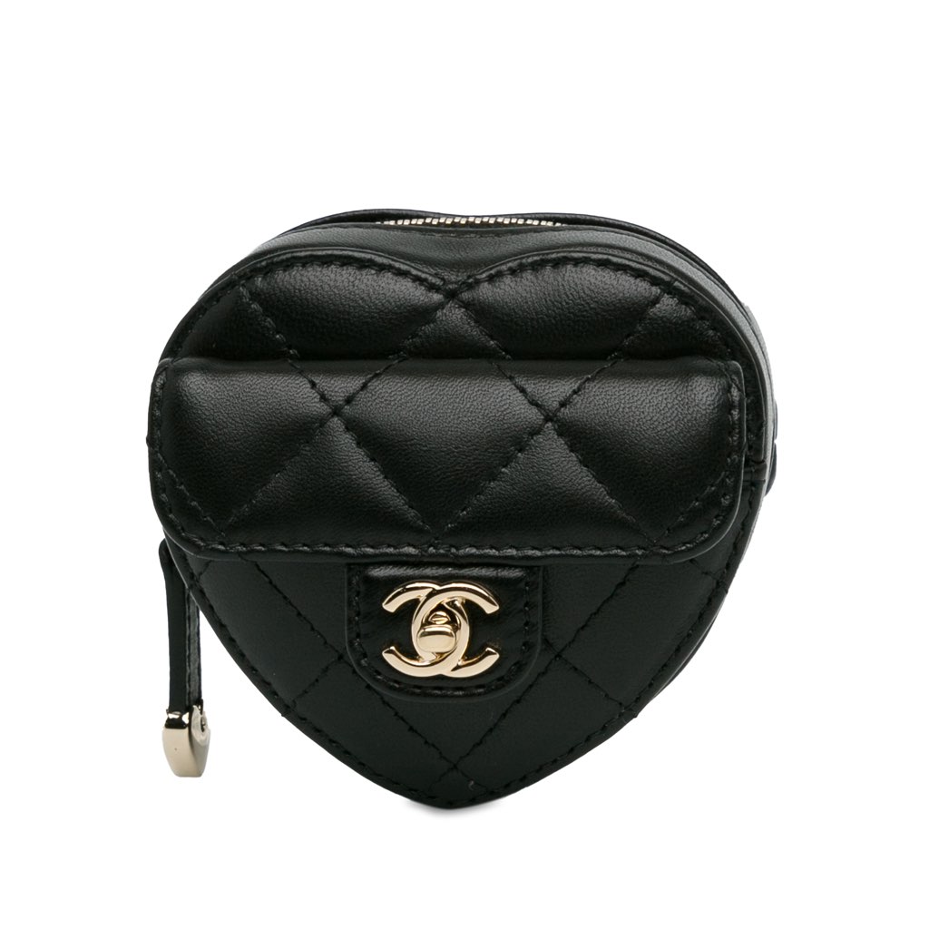 This coin pouch features a quilted lambskin leather body, an elastic wrist strap, a top zip closure, and an exterior flap pocket with CC turn lock closure.