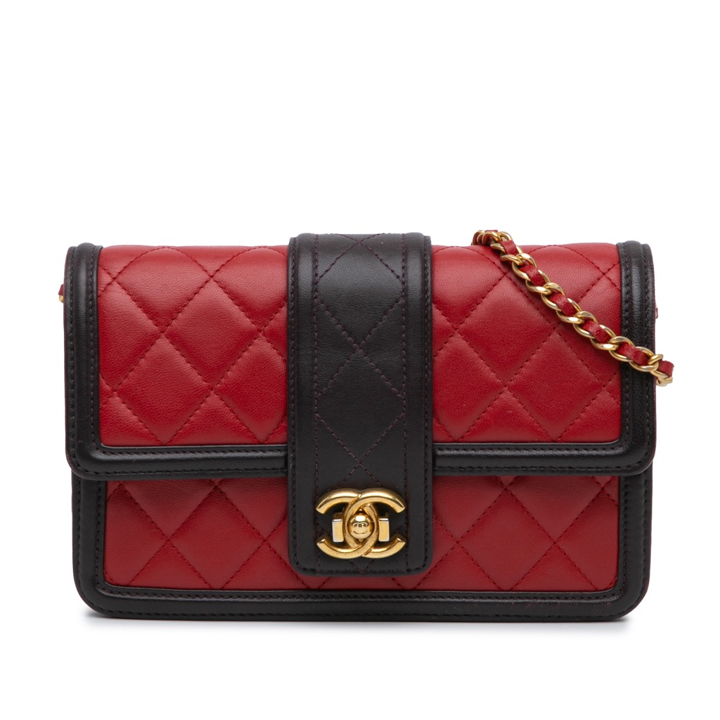 This wallet on chain features a quilted lambskin body, a leather-woven chain strap, a flap with CC push lock closure, and interior zip and slip pockets.