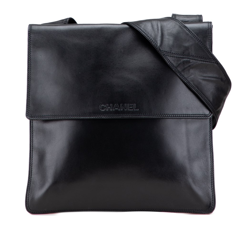 This messenger bag features a leather body, flat leather strap, a front flap, and an interior zip pocket.