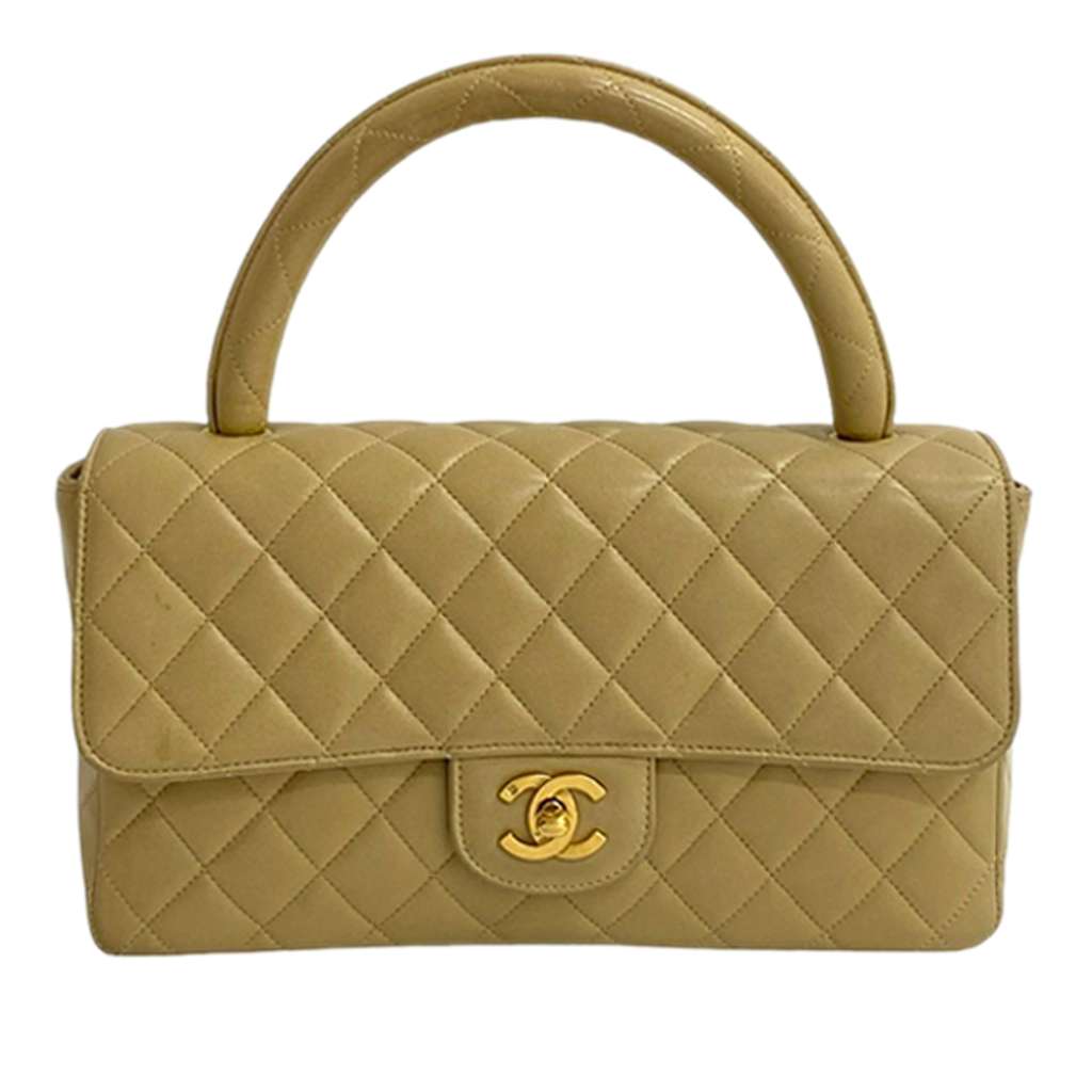 TheisKelly handbag set features lambskin leather body, a rolled leather top handle, a front flap with a twist lock closure, an exterior back slip pocket, and interior slip pockets.