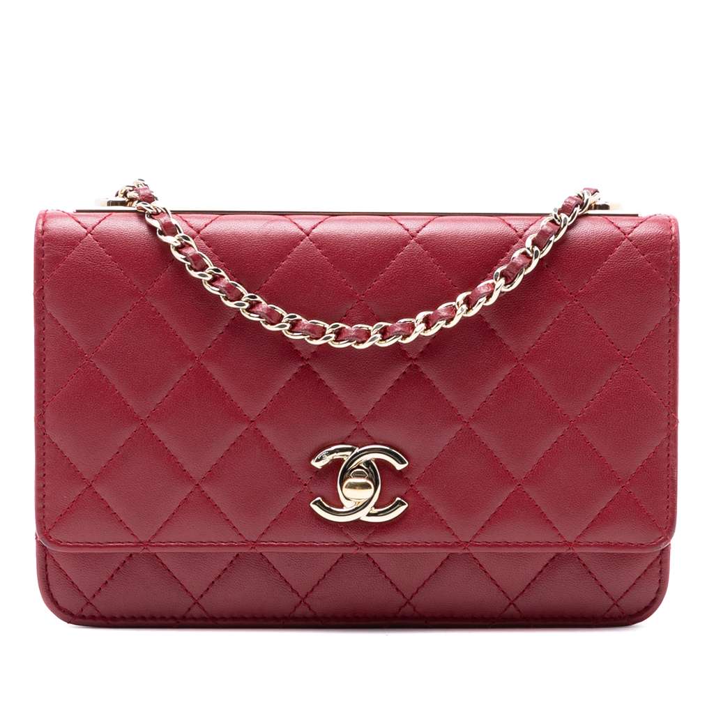This wallet on chain features a quilted lambskin leather body, a leather-woven chain link strap, a front flap with interlocking CC turn lock closure, and interior zip and slip pockets.