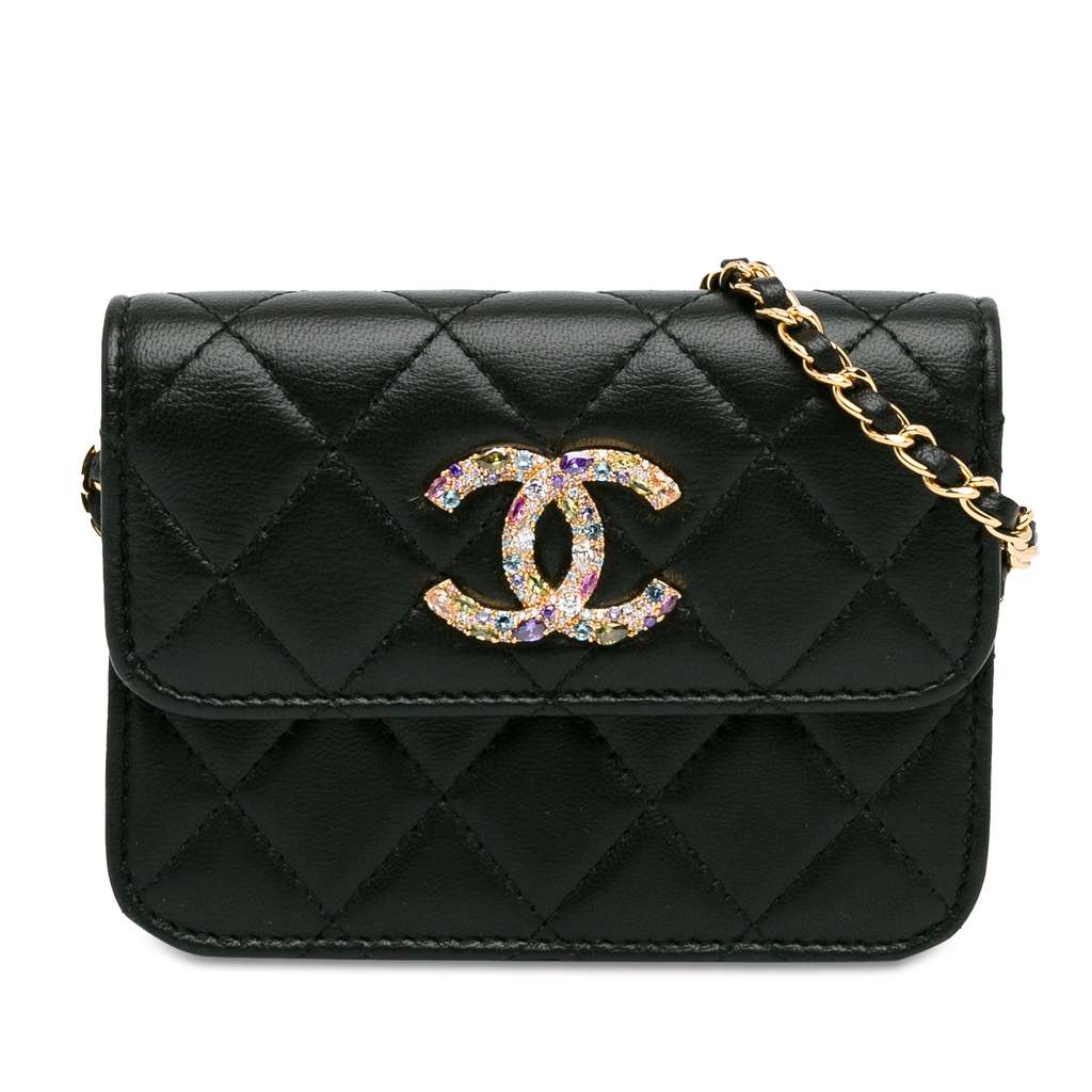 This crossbody bag features a quilted lambskin leather body, a leather woven chain shoulder strap, and a front flap with magnetic snap closure.