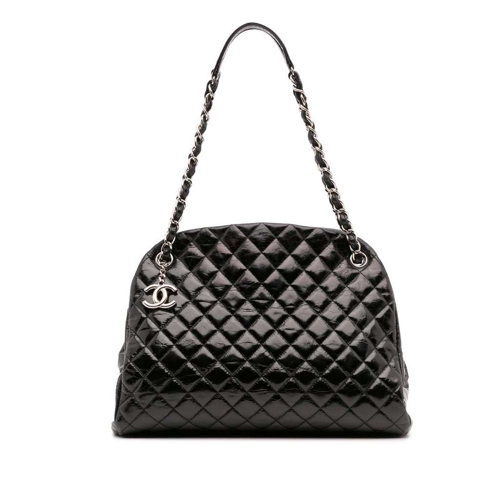This bowling bag features a quilted leather body, a silver-tone chain straps, an open top, an interior compartment with metal snap closure, and interior zip and slip pockets.