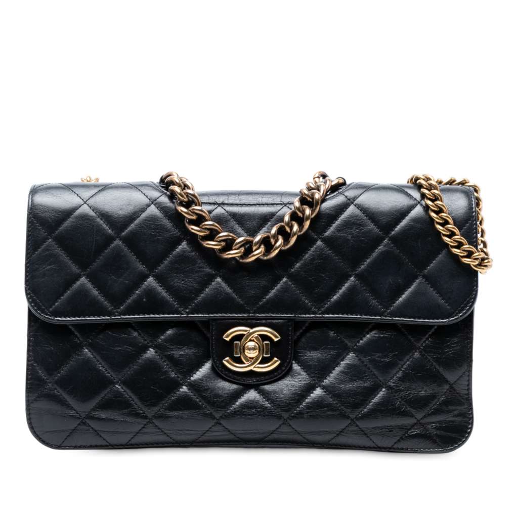This satchel features a quilted calf leather body, a top chain handle, a chain link shoulder strap with a leather shoulder guard, a front flap with CC push lock closure, an exterior back slip pocket, and an interior zip pocket.